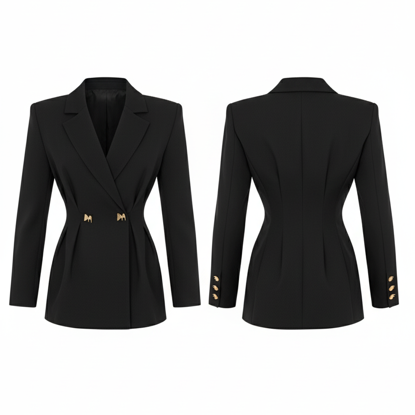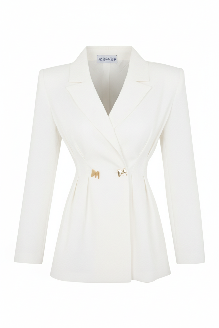 Krep saten kumaşın zarif dokusuyla modern gücü buluşturan Ulric Ceket, vatkalı omuz yapısı ve beli vurgulayan pens detaylarıyla heykelsi bir siluet oluşturur. Altın tonlu metal aksesuarlar ve iç astar detaylarıyla kusursuz bir bitiş sunar. Gündüzden geceye uzanan zamansız bir şıklığın anahtar parçasıdır.