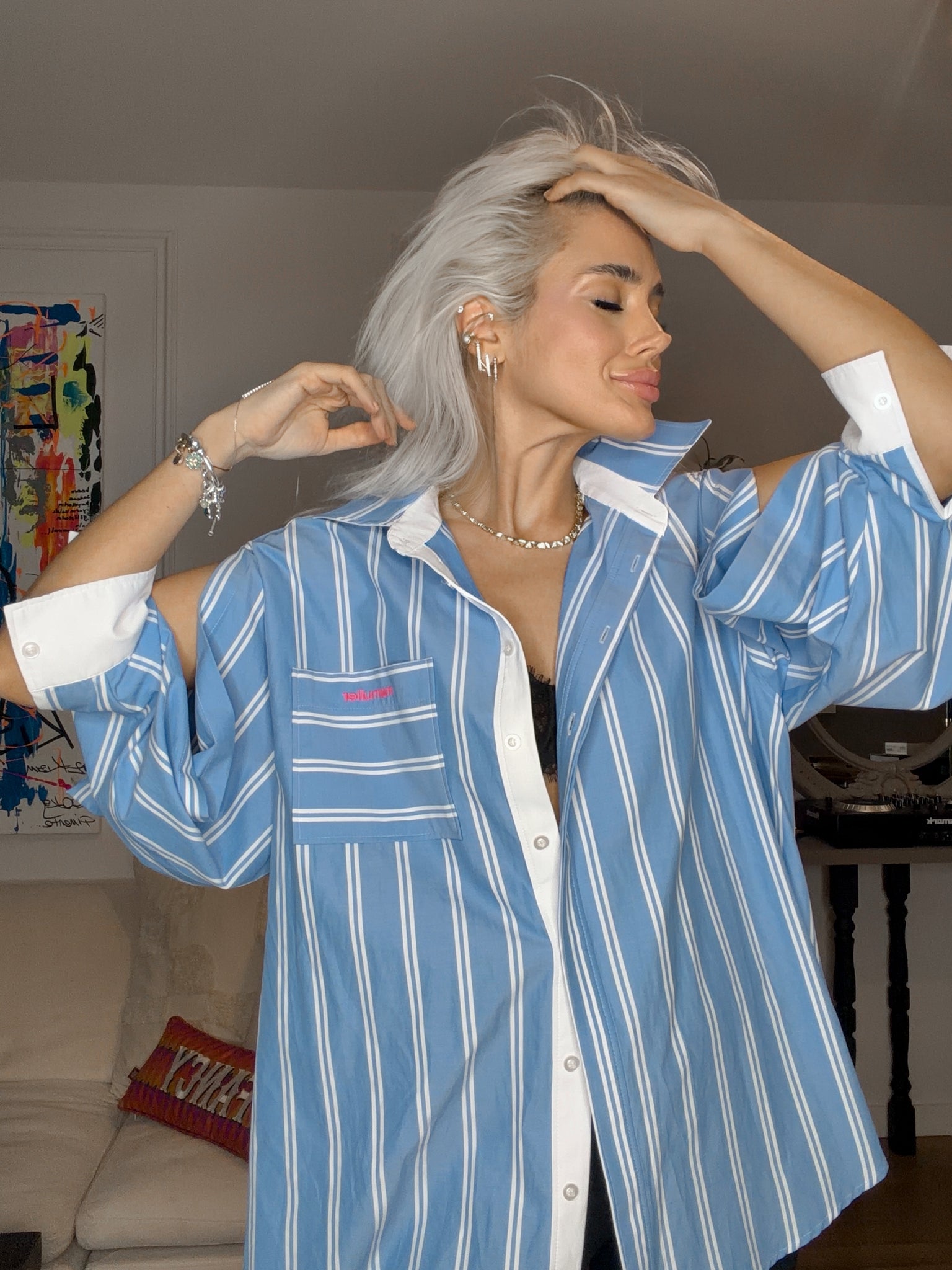 Nakış detaylı oversize kesim cepli kol dekolteli gömlek.